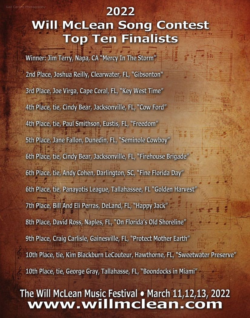 2PM Band ANOTHER FINE MESS Aripeka Art Crummer Band Back Porch Revival Bear & Robert Belle and The Band Bill & Eli Perras Bill Metts Bob Patterson Brian Smalley Callicarpa Carly Bak Carrick/ Simmons Charlie Robertson Chris Kahl Chris Kastle Chuck Hardwicke and The Hart Line craig daniel hardin with Solessé Dan Gribbin Dennis Devine Doug Spears Eileen Kozloff Ellen Bukstel & Friends Emmett Carlisle Florida Cracker Cowboys FLORIDA'S TROUBADOURS Frank Lindamood Frankie J & the Chicken Parade George Gray and Friends Grant Livingston Grant Peeples Hannah's Whirl In Good Company Jackson Creek James Hawkins Jane Fallon Jeanie Fitchen Jerry Mincey Joey Errigo John Dickie IV John French Connection Joshua Reilly Keith Hope Kim LeCouteur Lauren Heintz Lee Hunter & Joey Kerr Lisa Thomas Lucky Mud Mary Ann Di Nella & Girls Mary Beth Campbell & Friends Max Watson Mel and Vinnie Mike Handley St Pete Shanties Mike Mac Mike Worrall Paddy League Passerine Patchwork Peg and Em Peters Road Swamp Blues Band Ray Sealey Razz Taylor Red and Christopher and Their all-Star Band Red Wolf Strings Roadside Revue Scott Jackson Still Friends Jim Terry The Ashley Gang The Flathead String Band The Gentleman The Julian/Cherkinsky Orchestra The Lilly Jane Band The Lubben Brothers The Wandering Hours This Frontier Needs Heroes Tom Scudiero WOUNDTIGHT
