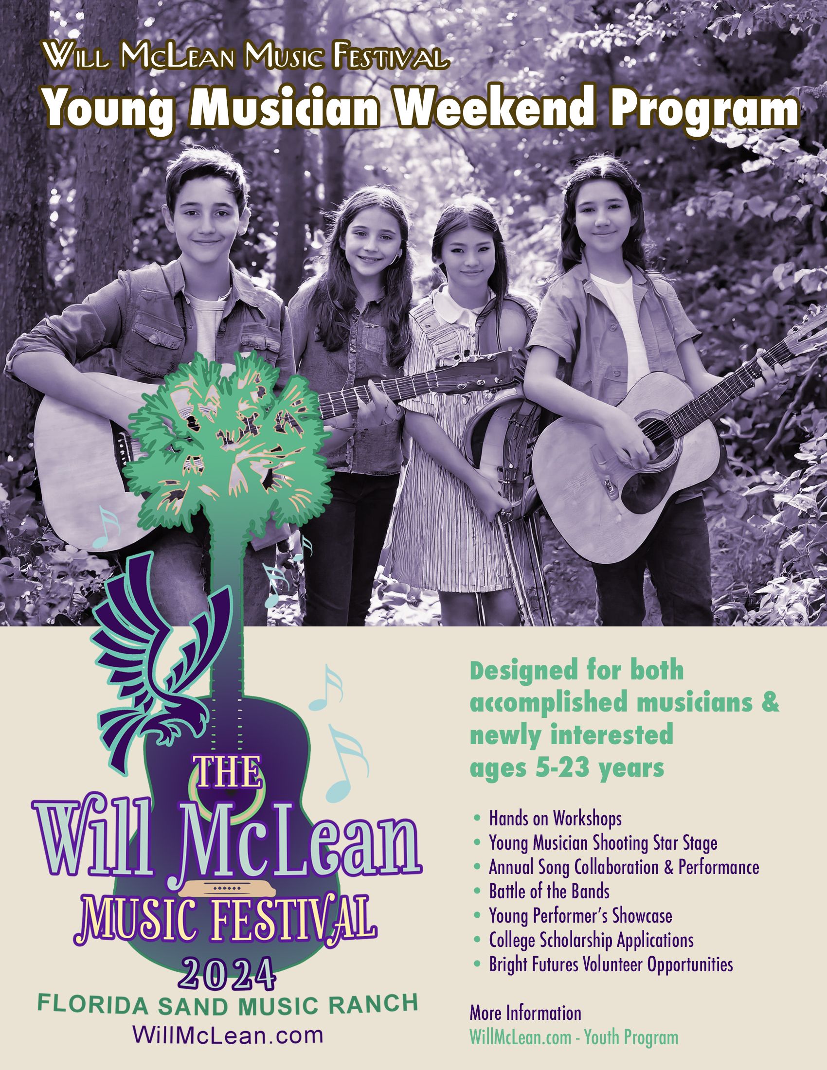 Will McLean Music Festival is proud to provide a premier educational and motivational opportunity for young people elementary through college ages. In coordination with the annual Will McLean festival, our Young Musician’s Program Camp strives to offer the youth of the State of Florida an exceptional experience. As the only program of its nature in the State of Florida we are proud to acknowledge many alumni who have gone on into professional careers in music but that’s not at the heart of the program. We strive to offer those who are talented performing youth, as well as those who have no previous knowledge, opportunities to learn, perform, make music friends, mentor, and express themselves through the art of music as they are our future. Whether you are a young songwriter, play an instrument, sing, or simply have an interest in acoustic Folk, Americana, Gospel, International Folk, Old Time, or Bluegrass styles we have a place for you. Recently, the Will McLean Foundation has partnered with several other Not-For-Profit organizations to be able offer additional opportunities to those who may not be able to otherwise attend the program. In addition, the Will McLean Foundation offers college scholarship opportunities.